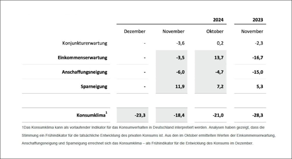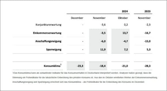 Die Verbraucher-Stimmung in Deutschland hat sich im November spürbar eingetrübt. Für Dezember wird für das Konsumklima im Vergleich zum Vormonat (revidiert –18,4 Punkte) ein Rückgang von 4,9 Zählern auf –23,3 Punkte gemessen.