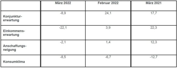 Entwicklung der einzelnen Indikatoren im März 2022 im Vergleich zum Vormonat und Vorjahr (Quelle: GfK)