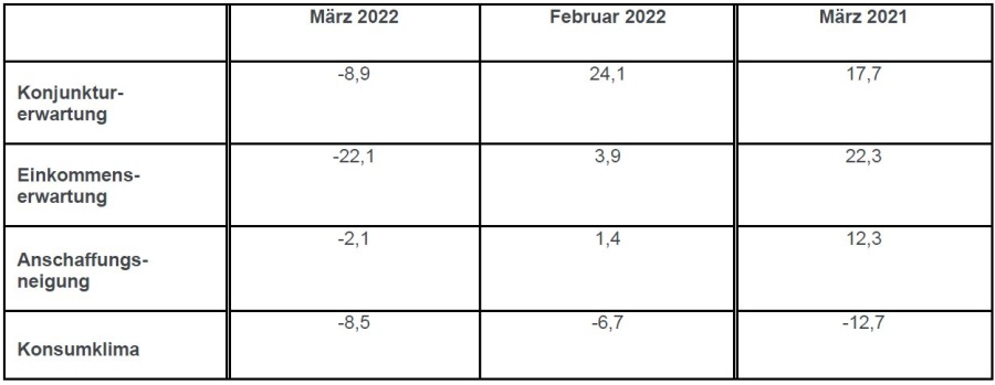 Der Krieg in der Ukraine hinterlässt auch bei der Verbraucherstimmung der Deutschen deutliche Spuren und führte im März zu einer erheblichen Eintrübung beim Konsumklima. Konjunktur- und Einkommens-Aussichten brechen ein und verzeichnen teilweise neue Rekordtiefs nach der Finanzkrise 2009. So prognostiziert GfK für den April –15,5 Punkte und damit sieben Zähler weniger als im März dieses Jahres.