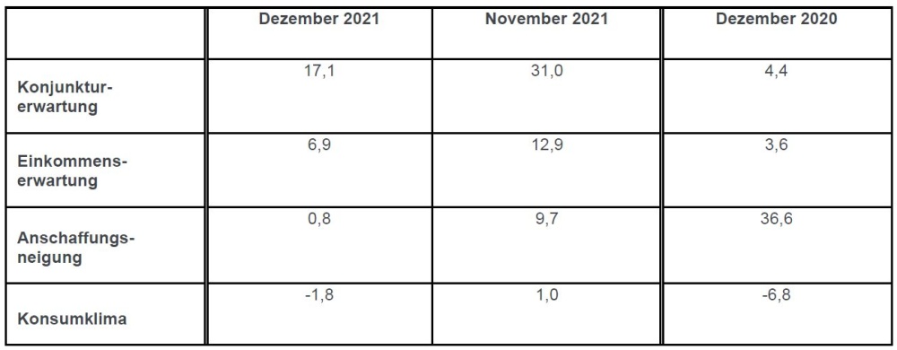 Die Verbraucherstimmung in Deutschland kühlte im Dezember spürbar ab. Sowohl die Konjunktur- und Einkommens-Erwartung als auch die Anschaffungs-Neigung büßten deutlich ein. Da auch die Sparneigung erneut ansteigt, prognostiziert GfK für das Konsumklima im Januar 2022 –6,8 Punkte und damit fünf Punkte weniger als im Dezember dieses Jahres (revidiert –1,8 Punkte).