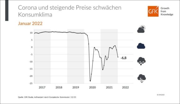 „Die Konsumstimmung wird auch zum Jahresende von zwei Seiten stark unter Druck gesetzt. Hohe Inzidenzen durch die vierte Welle der Corona-Pandemie mit weiteren Beschränkungen sowie deutlich gestiegene Preise setzen dem Konsumklima mehr und mehr zu. Vor allem die 2G-Regel für weite Teile des Einzelhandels versetzten dem Weihnachtsgeschäft einen schweren Schlag“, erklärt Rolf Bürkl, GfK-Konsumexperte. „Auch die Aussichten für den Beginn des kommenden Jahres sind vor dem Hintergrund der rasanten Ausbreitung der Omikron-Variante gedämpft.“