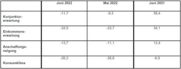 GfK Tabelle Konsumklima Indikatoren Juni 2022