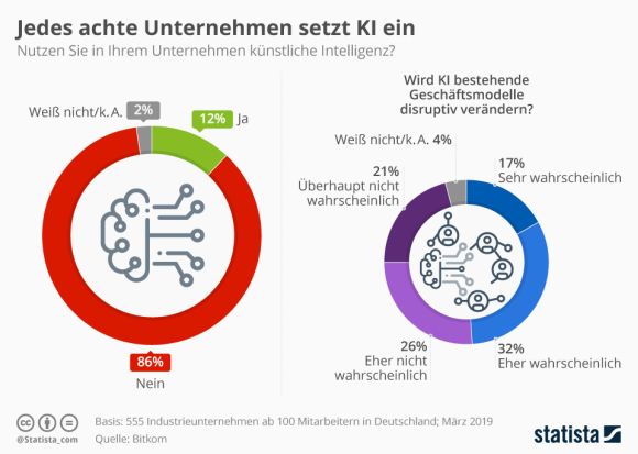 Laut einer aktuellen Bitkom-Umfrage nutzten hierzulande derzeit zwölf Prozent der Unternehmen künstliche Intelligenz. In 86 Prozent der befragten Unternehmen sei KI kein Thema, obwohl die Teilnehmer größtenteils der Meinung sind, dass diese in Zukunft wichtig sein wird.