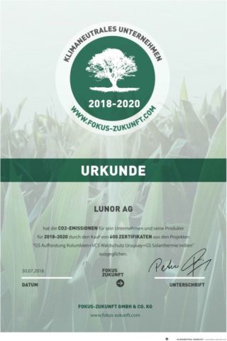 Darum ist es für Lunor eine logische Konsequenz, sich diesen schwierig zu verhindernden Emissionen zu stellen und diese mithilfe des Projektes von „Fokus-Zukunft GmbH & Co. KG“ zu kompensieren und erneut einen elementaren Beitrag zum Umweltschutz zu leisten.
