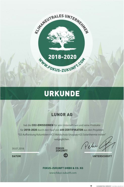 Die mithilfe des sogenannten CO2-Footprints ermittelten Werte gleicht Lunor mit drei ganz besonderen Projekten der „Fokus-Zukunft GmbH & Co. KG“ aus: mit der Wiederaufforstung von Wäldern in Kolumbien, mit Waldschutzprogrammen in Uruguay und mit dem Bau einer Solarthermie in Indien. Alle drei Investments kompensierten die kompletten CO2-Emissionen der Brillenmanufaktur für die nächsten zwei Jahre.