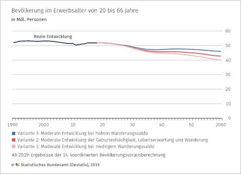 Im Jahr 2018 waren in Deutschland 51,8 Millionen Menschen im erwerbsfähigen Alter zwischen 20 und 66 Jahren. Bis zum Jahr 2035 wird die erwerbsfähige Bevölkerung um rund 4 bis 6 Millionen auf 45,8 bis 47,4 Millionen schrumpfen. Anschließend wird sie sich zunächst stabilisieren und danach bis zum Jahr 2060 je nach der Höhe der Nettozuwanderung auf 40 bis 46 Millionen sinken. Ohne Nettozuwanderung würde sich die Bevölkerung im Erwerbsalter bereits bis 2035 um rund 9 Millionen Menschen verringern.