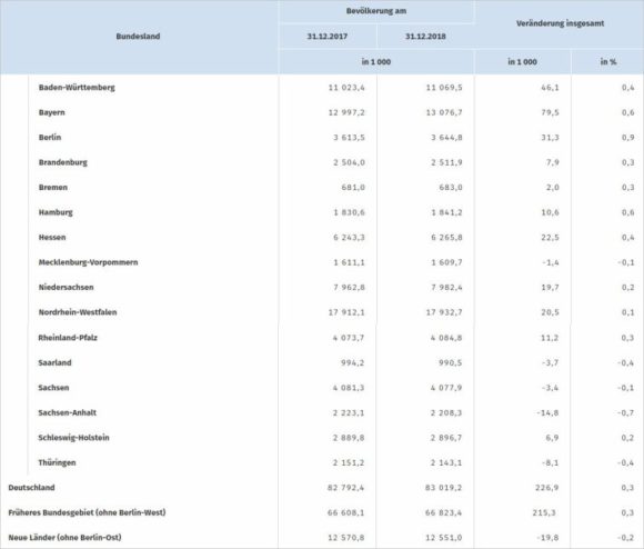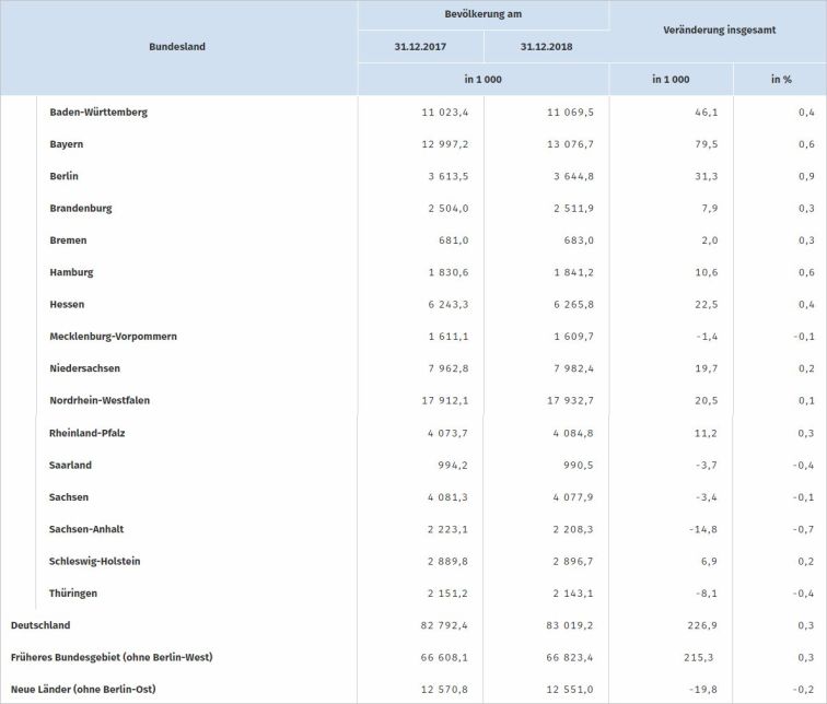Die Bevölkerung Deutschlands ist im Jahr 2018 um 227.000 Personen (+0,3%) gewachsen. Zum Jahresende 2018 lebten damit 83,0 Millionen Menschen in Deutschland.