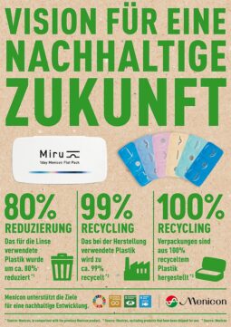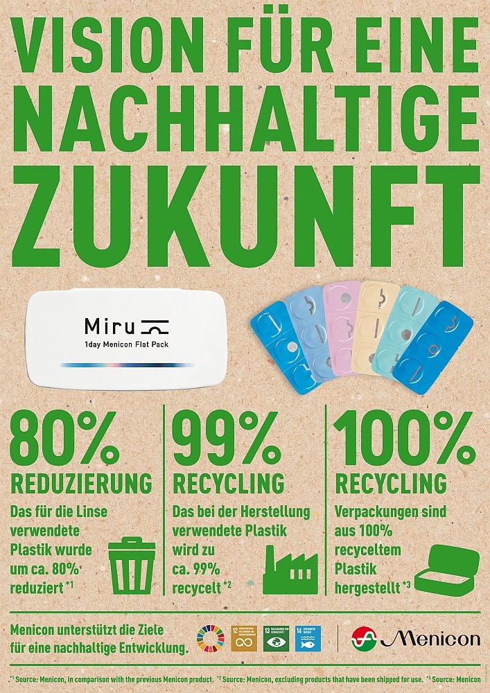 Ein Beispiel ist die Entwicklung der Tageslinse „Miru 1day Flat Pack“. Die im Herstellungs-Prozess verwendeten Kunststoffe sind zu 99 Prozent recycelt. Für die Umverpackungen werden 100 Prozent recycelte Kunststoffe verwendet. Darüber hinaus führt die nur 1 mm dünne Blisterpackung zu einer 80-prozentigen Reduzierung des Kunststoff-Abfalls.