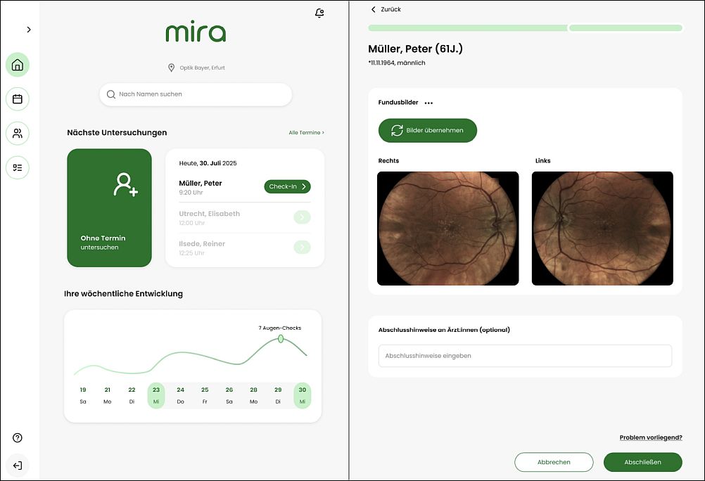 Die Software-Plattform „mira“ des Berliner Health-Tech-Unternehmens Mirantus (Berlin) ist auf Expansionskurs. Die Software wird bereits an über 200 Standorten in Deutschland für Augen-Checks eingesetzt; bis 2027 sollen mehr als 1.000 Standorte in Deutschland, Österreich und der Schweiz angebunden sein.