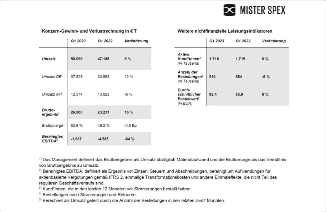 Mister Spex mit Zahlen zum ersten Quartal 2023 (Quelle: Mister Spex SE)