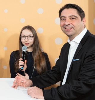 Augenarzt und Myopie-Forscher Dr. med. Hakan Kaymak mit seiner kurzsichtigen Tochter Leila beim Digitalkongress zur Einführung des Myopie-Glases von Hoya
