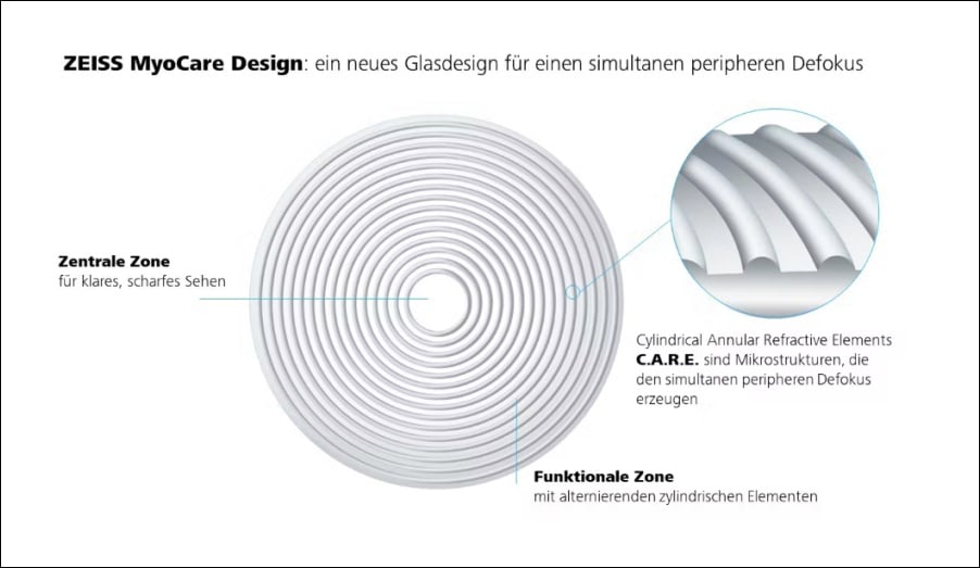 Das Myopie-Glas MyoCare setze mit Mikrostrukturen einen simultanen Defokus für das periphere Sehen. Rund um das Zentrum des Glases mit der Kurzsichtigkeit korrigierenden Fläche sind – fast unsichtbare – konzentrische Kreise mit alternierender Stärke als konkurrierende Korrektionszonen simultan mit Korrektionszonen eingearbeitet. Der damit erzielte periphere Defokus für das Auge verzögere laut Zeiss nachgewiesenermaßen wirksam das über das physiologisch normale hinausgehende Längenwachstum des Auges und hemme so die Progression von Myopie.