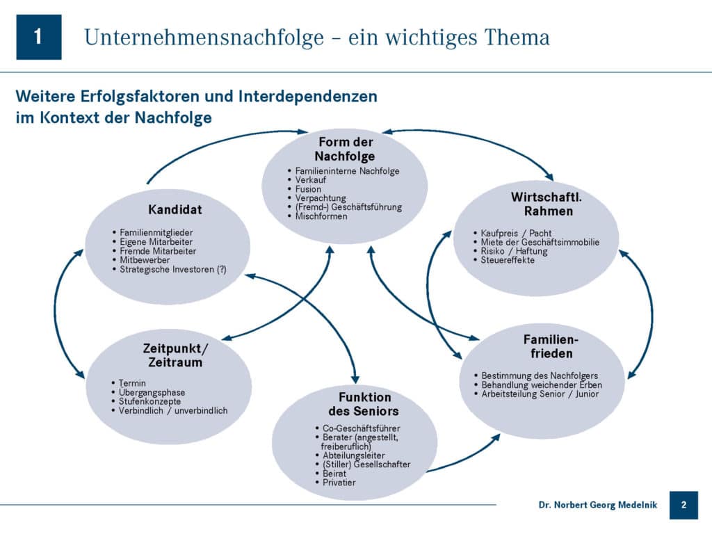 Die Basis der Nachfolgeplanung bildet der wirtschaftliche Rahmen des Unternehmens, denn daraus leitet sich der Unternehmenswert ab. Die Qualität des Unternehmens, welche sich in der Höhe des Unternehmenswertes manifestiert, bestimmt erfahrungsgemäß in hohem Maße die Größe des Nachfolgekandidaten-Pools: Größere Unternehmen aus höheren Umsatzgrößenklassen ziehen eine höhere Zahl an Übernahme-bzw. Kaufinteressenten an. Die Herkunft des Nachfolgekandidaten (z. B. aus der Familie, dem Kreis der Mitarbeiter oder von extern) beeinflusst die Nachfolgeform, die Zeitplanung, sowie die Funktion des Seniors nach erfolgter Übergabe des Unternehmens. Schließlich muss eine umsichtige Nachfolgeplanung auch geeignet sein, die Interessen der übrigen Familienmitglieder zu berücksichtigen, um den Familienfrieden dauerhaft zu wahren.