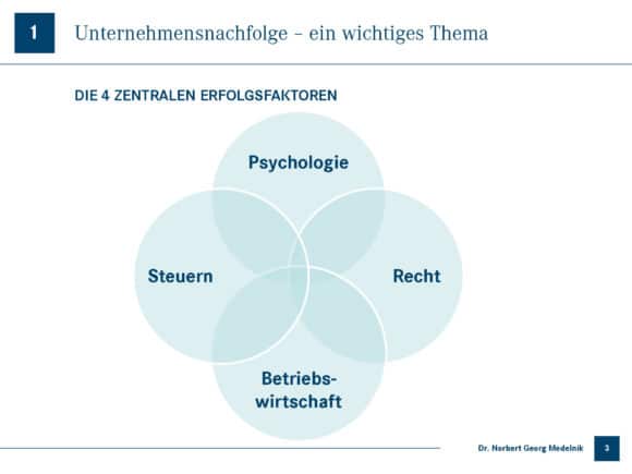 Dies macht einerseits deutlich, dass jede Nachfolgeplanung eine individuelle Lösung benötigt, da die Situation und die Ausprägungen der Einflussfaktoren z. T. vollkommen unterschiedlich gelagert sind. Ersichtlich wird aus Grafik 2 aber auch, dass sich im Zuge der Nachfolgeplanung mehrere in sich komplexe Fachgebiete überschneiden: