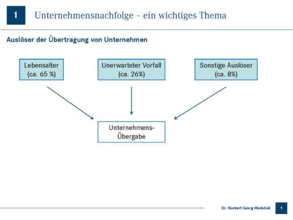 In ca. 65% der Fälle besteht der Anlass der Übergabe des Unternehmens darin, dass der Unternehmer das Renteneintrittsalter erreicht hat. Etwa 26% der Übergaben werden durch unerwartete Vorfälle wie Unfall, Krankheit usw. ausgelöst. Um das Unternehmen gegen einen solchen unvorhergesehenen Fall möglichst gut zu schützen, empfiehlt sich die Vorbereitung und Hinterlegung eines „Notfallkoffers“, in dem bei Ausfall der Firmenleitung in kompakter Form die wichtigsten Informationen zur nahtlosen Weiterführung des Unternehmens hinterlegt sind. Hinzu kommen in ca. acht Prozent der Fälle „sonstige Auslöser“ in Form von Familienstreitigkeiten, Ehescheidung usw.