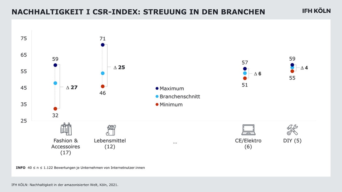 Ebenfalls im Juli veröffentlichte das IFH Köln seine Studie „Nachhaltigkeit in der amazonisierten Welt“. Die Studie analysiert den Status quo in Sachen Nachhaltigkeit im Handel und beschäftigt sich mit der Frage, wie der Handel adäquat mit den steigenden Konsumentenbedürfnissen nach verantwortlich hergestellten Produkten und unternehmerisch nachhaltigem Handeln umgehen kann. Hierfür wurden 1.500 Internetnutzer:innen im März 2021 online befragt und der Markt analysiert. Zu den im CSR-Index betrachteten Branchen zählen CE/Elektro, DIY, Drogerie & Tierbedarf, Fashion & Accessoires, Freizeit & Hobby, Lebensmittel sowie Wohnen & Einrichten.