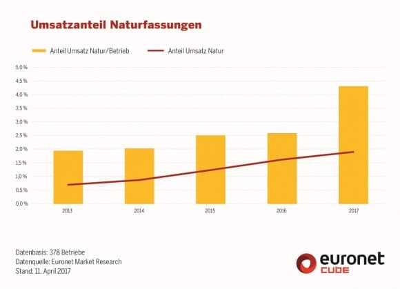Wie die Daten von Euronet Market Research zeigen, entfielen 2016 rund 1,6 Prozent des Fassungsumsatzes (das sind 0,6 Prozent der Stückzahlen) auf Holz & Co (in der Grafik als rote Linie dargestellt). Betrachtet man allerdings nur die Betriebe, die Naturfassungen verkaufen (gelbe Balken), dann ergibt sich ein anderes Bild: Dort steht ein Umsatzanteil von 2,6 Prozent in den Büchern.
