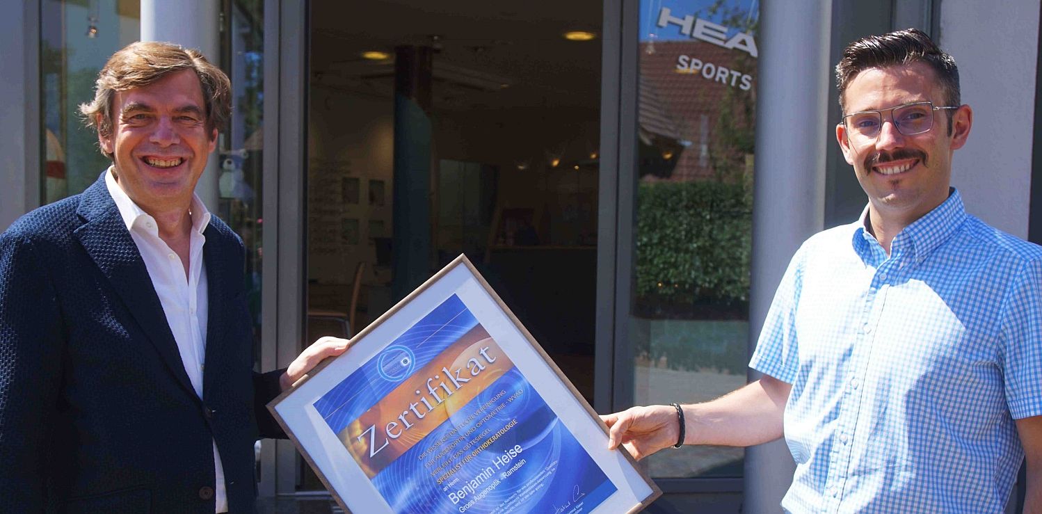 WVAO-Geschäftsführer RA Hartmut Glaser (im Bild links) freute sich deshalb, am 23. Juli 2020 die Zertifikats-Urkunde in Ramstein überreichen zu dürfen. „Wir wünschen Benjamin Heise weiterhin viel Erfolg und Freude mit der Ortho-K und dass noch mehr Verbraucher auf diese tolle Versorgungsmöglichkeit und die exzellenten Ortho-K-Spezialisten aufmerksam werden.“