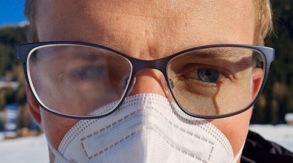 Gesichtsmasken können im Winter zu einer beschlagenen Brille führen: Bei dieser Brille trägt das linke Glas (vom Betrachter aus rechts) die neue Antibeschlags-Nanobeschichtung, das rechte Glas ist unbeschichtet (Bild: ETH Zürich)