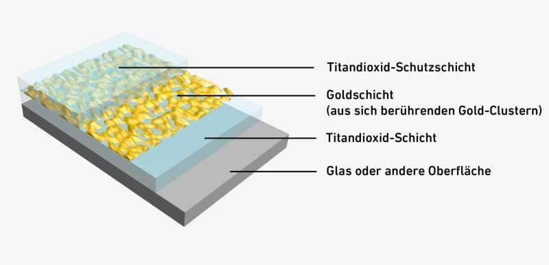 Vom teuren Gold werde so wenig benötigt, dass die Materialkosten trotzdem tief sind. „Kleinste und extrem dünne Cluster aus Gold befinden sich zwischen zwei Schichten aus Titandioxid, einem elektrisch isolierenden Material. Diese beiden Schichten erhöhen aufgrund ihrer Lichtbrechungs-Eigenschaften die Wirksamkeit der Wärmegewinnung. Außerdem dient die obere Titandioxid-Schicht wie ein Lack dem Schutz der Goldschicht vor Abrieb. Die ganze Sandwich-Beschichtung ist bloß zehn Nanometer dünn.“ Zum Vergleich: Blattgold sei etwa zwölfmal dicker.