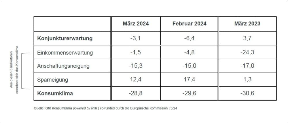 Werte der einzelnen Indikatoren im März 2024 im Vergleich zum Vormonat und Vorjahr (Quelle: GfK/NIM)