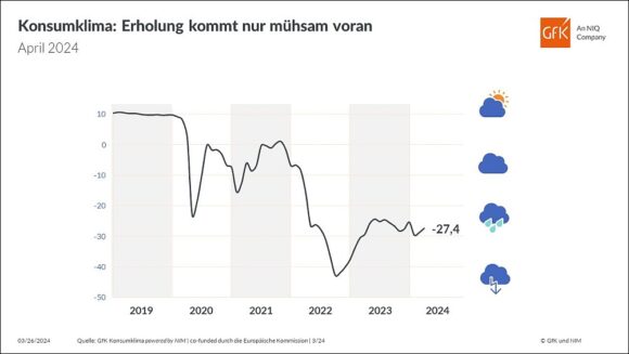 Die Aufhellung der Verbraucher-Stimmung in Deutschland schritt auch im März nur langsam voran. Das Konsumklima verbesserte sich zum zweiten Mal in Folge. GfK-Prognose für April im Vergleich zum Vormonat: plus 1,4 Punkte auf –27,4 Zähler.