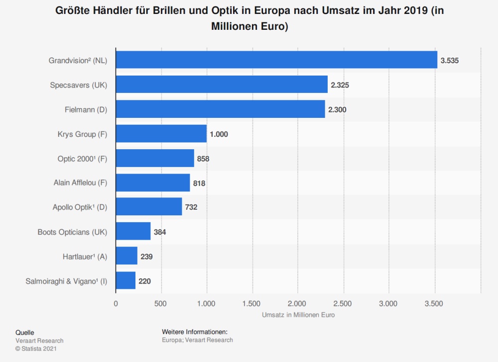 Die Fielmann AG mit Sitz in Hamburg war 2019 der drittgrößte Händler für Brillen und Optik in Europa und dürfte den Zweitplatzierten mittlerweile überholt haben.