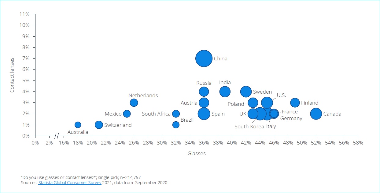 Verbraucher im Ländervergleich 2020: Anteil der Befragten, die eine Brille tragen / Kontaktlinsen verwenden – die Blasengröße gibt an, dass die Verbraucher beides haben: Brille und Kontaktlinsen