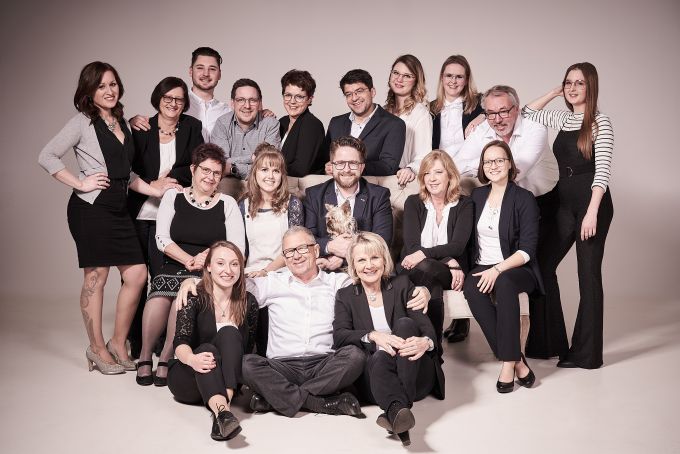 Das Team von Optik Tannek um Christian (Mitte, mit Hund) und Frank Tannek (eine Reihe darüber)