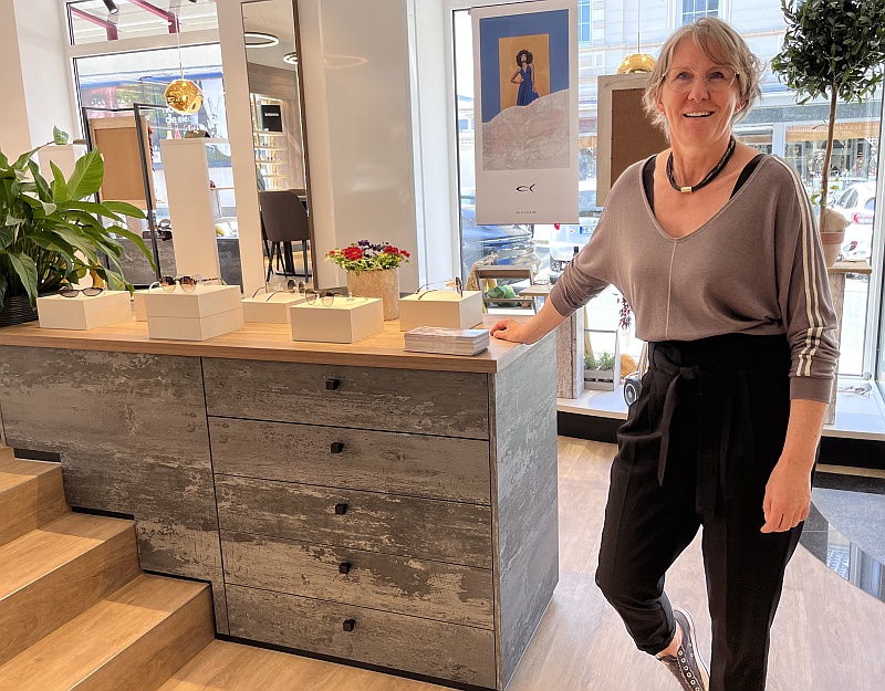 Kunden schauen vorbei, um Hallo zu sagen oder einen Kaffee zu trinken. Am Tag des Interviews brachte ein Besucher sogar Kuchen vorbei. Die Geschäftsführerin nimmt sich Zeit, Hektik und Unruhe sind woanders, die luftige Ladengestaltung trägt viel zur Entspanntheit bei – letztlich die beste Voraussetzung für ein gelungenes Brillen-Verkaufsgespräch.