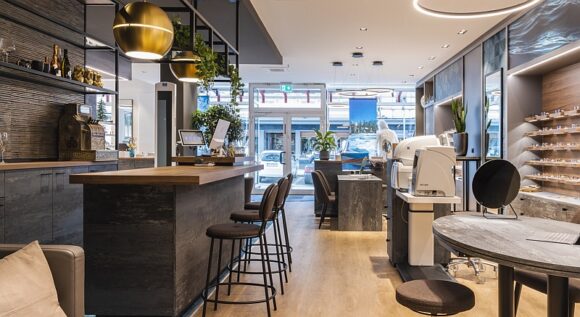 Zum neugeschaffenen Wohnzimmer-Gefühl bei Augenoptik Luckas gehört ein langer Tresen mit Hockern