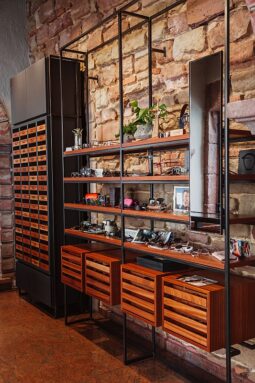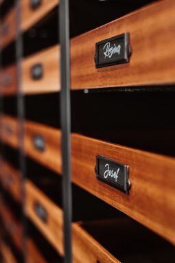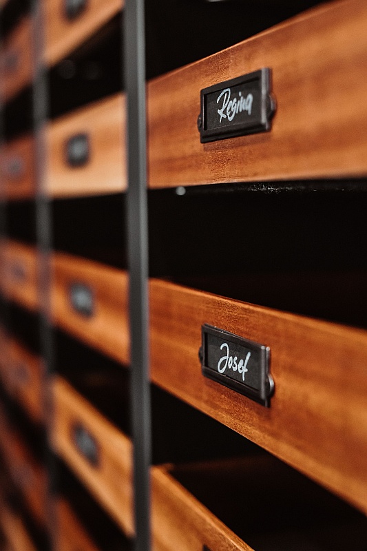 Für besonderen Gesprächsstoff sorgt ein großer Schrank mit Holzschubladen voller Retro-Beschläge. Hinter kleinen schwarzen Schildern mit verschiedenen Vornamen sind die fertigen Kundenaufträge sortiert. Auf weichem Filz warten die Brillen darauf, abgeholt zu werden. „Eine Reihe beinhaltet unseren Tagesablauf, so sehen wir, welcher Kunde als nächstes unseren Laden betritt, für jeden haben wir alles liebevoll vorbereitet.“
