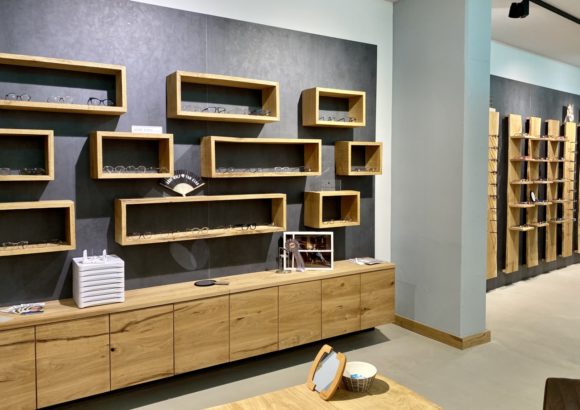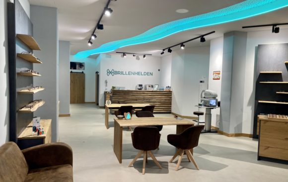 Das Gebäude, in dem die Brillenhelden eingezogen sind, war Mitte der 90er-Jahre ein Schuhgeschäft, später eine Einrichtung für Senioren in Tagespflege. Für die Transformation in ein modernes Augenoptikgeschäft mit einer Fläche von über 160 Quadratmetern wurden Wände eingezogen und viel konzeptionelle Vorarbeit geleistet. Statt für Glas und steriles Weiß entschieden sich Natalie und Franz beim Ladenbau für grobes Holz mit Betonanmutung. Per Knopfdruck lassen sich unterschiedliche Stimmungen erzeugen.