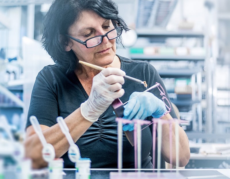 Die klassisch gelötete Augenrandfassung erzielt dank CNC-Technologie absolute Präzision, bei den Lackierungen der Brillenfassungen aller Materialien kommen neben aufwendigen Handarbeiten auch Airbrush- und Lasertechnik zum Einsatz. „Wir bieten die optimale Auswahl der richtigen Oberflächenveredelung und montieren sowohl die von uns gefertigten Produkte als auch die von unseren Kunden angelieferten Fassungen und Teile“, erklärt Picicci, der vier Augenoptiker*innen angestellt hat, die für die ergonomische Ausrichtung der Fassungen sorgen.