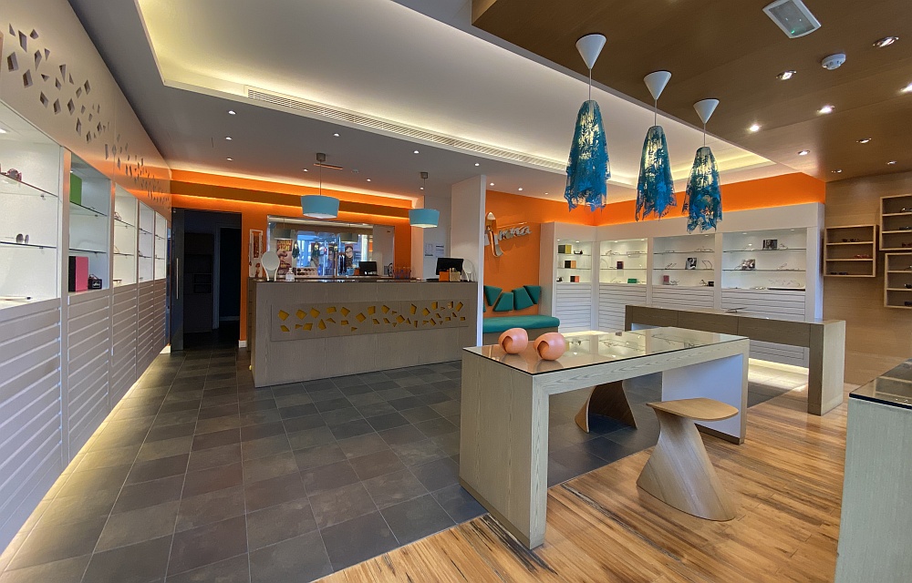 „Anna by Top Vision Optics“: Das Flair einer noblen Boutique mit geschlossener Präsentation und orangen Farbakzenten, die ein wenig Holland nach Dubai bringen
