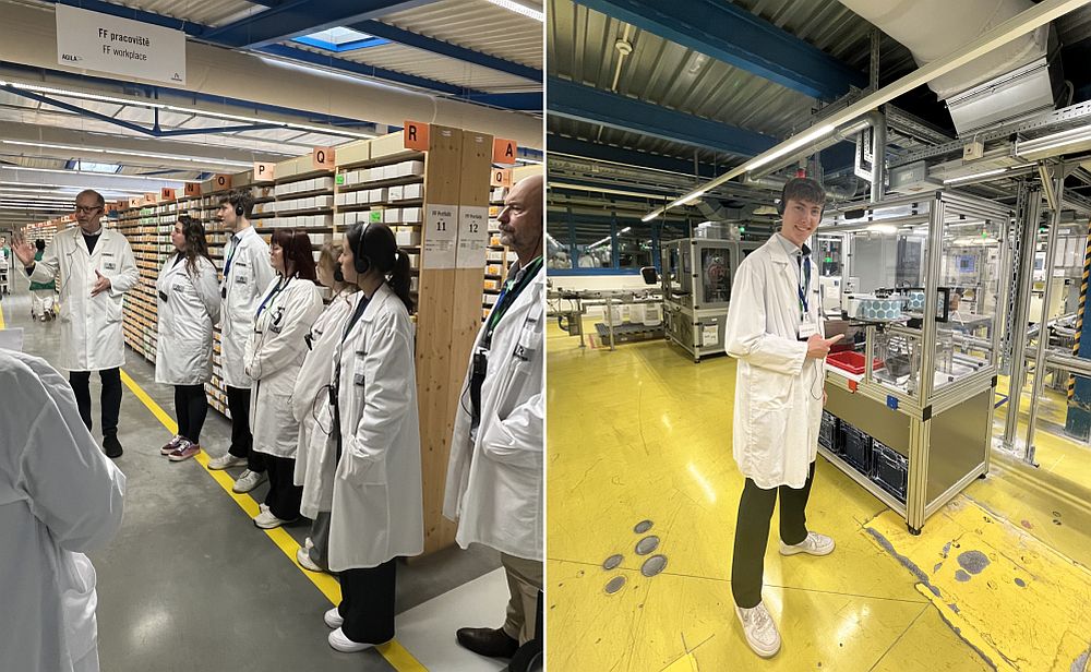 Bild links: Es wird noch viel Handarbeit in Klattau geleistet, aber auch hier halten zunehmend Maschinen und die Automatisierung Einzug; Bild rechts: Karel Hitha erklärt, warum es graue und schwarze Auftragskisten gibt. An dieser Stelle der Produktion sind die schwarzen unbeliebt, denn hier kommen die fehlerhaften Aufträge in schwarzen Kisten zurück aus der Fertigung.