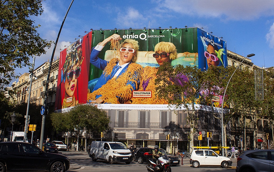 Über Nacht hat die Guerilla-Marketing-Aktion „Toiletpaper x Etnia Barcelona“ die Innenstadt eingenommen und in surreale, farbstarke und provokante Eyecatcher getaucht: perfekt geschminkte Models auf einem Zahnarztstuhl, mit Schmetterlingen auf dem Kopf, schillernden Käfern im Gesicht und exotischen Sittichen an den Schläfen, avantgardistische Hipster in schrillen, mit Spaghetti bekleckerten Outfits. Das alles ist eine Reminiszenz an die italienische Herkunft des Kunstmagazins Toiletpaper aus Mailand, mit dem die beiden Gründer Maurizio Cattelan und Pierpaolo Ferrari seit 2010 ihre Fans begeistern. Ein Heft, das nur aus Bildern besteht und gänzlich auf Text verzichtet. Die Bilder werden von Cattelan und Ferrari selbst erdacht und inszeniert. Sie sind meist surreal und absurd, aber auch humorvoll und ironisch; exakt so, wie bei der Nacht-und-Nebel-Aktion in Barcelona.