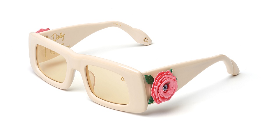 Die limitierte Kollektion „Toiletpaper x Etnia Barcelona“ präsentiert sich als Pop-Art-Statement: Bei beiden Modellen wird das ikonische Rosendesign mit dem Puppenauge zum Hauptmotiv der gewagtesten Sonnenbrillen der Saison. Star der Kollektion ist “Dolly”, die in Elfenbein, Bubblegum-Rosa und Schwarz erhältliche Fassung, die im nostalgischen Siebziger-Jahre-Charme daher kommt. Dass die beidseitig angebrachten Rosenknospen speziell im 3D-Drucker gefertigt wurden, ist mittlerweile vielleicht eher unspektakulär. Anders sieht das beim Zusammenklappen der Brillenbügel aus, wenn plötzlich das Puppenauge dabei zwinkert. Doch die Brille birgt noch eine weitere Überraschung: Beim Anhauchen – etwa zum Putzen – wird das Logo von Toiletpaper auf dem rechten Brillenglas sichtbar.