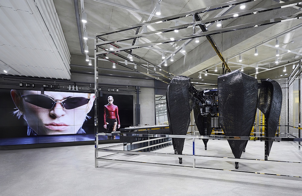 Das symbolträchtigste Ungetüm der avantgardistischen Retail-Erzählung ist ein sechsbeiniger Roboter im dritten Stock, der nach einem Jahr Forschung im markeneigenen Robotiklabor geboren wurde: Schwarz, glänzend, monströs. Wie eine Spinne, aber alptraumhaft groß und elegant. Daneben liegen die Sonnenbrillen, so kostbar, als müssten sie von eigens dafür gezüchteten Ungeheuern bewacht werden.