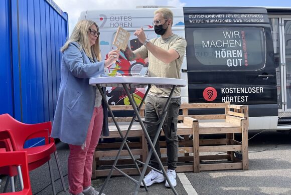 Unterdessen telefonierte die Hörakustikmeisterin Sandra Hirschberger mit acht Firmen, bis sie auf die Fördergemeinschaft Gutes Hören stieß, die leihweise einen mobilen Bus zur Verfügung stellte. Jetzt konnten auch wieder Hörtests und die Anpassung von Hörsystemen angeboten werden, wenn auch improvisiert auf engstem Raum. „Dabei komme ich unseren Kunden sehr nahe“, erzählt Hirschberger, „viele vertrauen mir ihre Sorgen an. Auch die Flutkatastrophe und ihre Folgen sind noch Thema.“