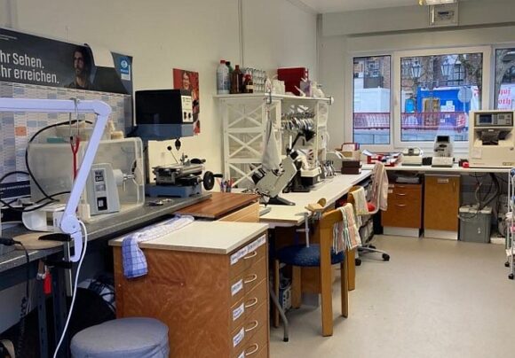 Die Augenoptik ist vorübergehend in Container gezogen – hier die Werkstatt