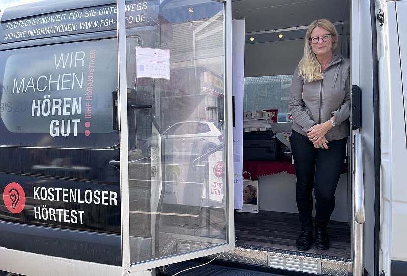 Hörakustikerin Sandra Hirschberger betreut Kunden im mobilen Bus