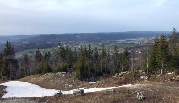 Aussicht im Jura-Gebirge bei Longchaumois – beim Julbo-Besuch Mitte April lag noch ein Rest Schnee (Bild: Patricia Perlitschke)