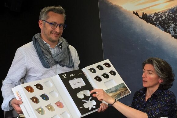 Christophe Baudry und Stéphanie Dugas zeigen die vielen Möglichkeiten für die Verglasung im RX Lab: Während die Marketingleiterin schon länger für Julbo tätig ist, fing der RX Manager erst Anfang April dort an (Bild: Patricia Perlitschke)