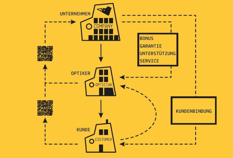 Neben der Vorliebe für kühnen, überraschenden Materialmix ist die Bindung an Kundschaft und Augenoptikpartner Kernthema von Lightbird und Corrado Rosson. Mittels QR-Code als integriertes Marketing-Werkzeug in der Brille, genauer im Bügelende, will man die Loyalität stärken und Endverbraucher mit Augenoptiker und Unternehmen enger und dauerhafter verbinden.
