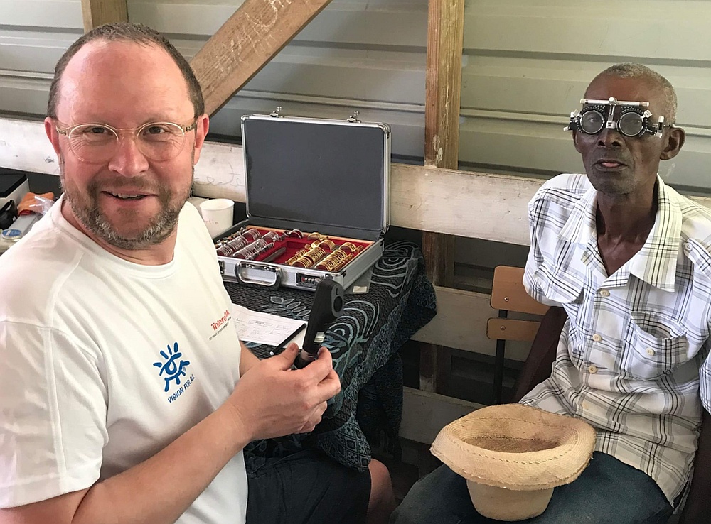 Martin Balke mit Ocular Globe auf Haiti 2019 beim Sehtest