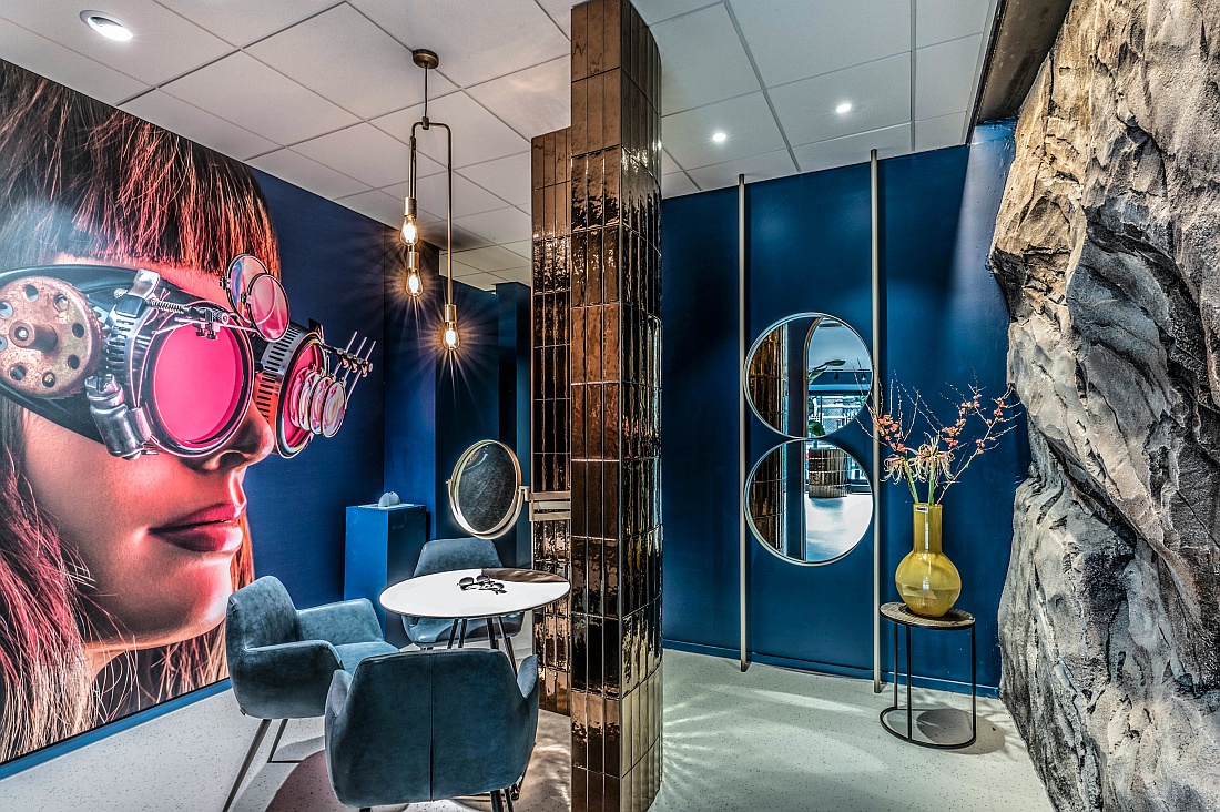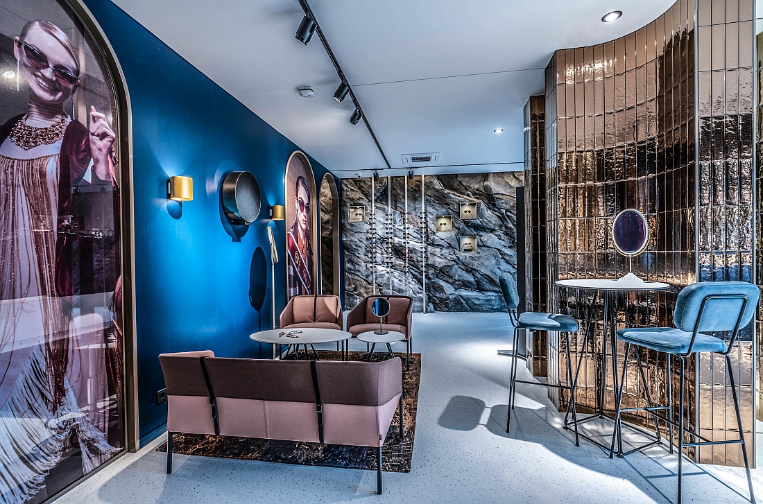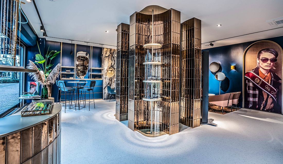 Im Zentrum des Raums ragen breite Säulen empor, die mit goldglänzenden Kacheln gefliest sind und funkelnd glitzern. Deckenbündig montierte Einbauleuchten schaffen einladende Lichtinseln für die Beratungsplätze. Doch der eigentliche Blickfang ist wohl die breite Seitenwand, die täuschend echt als roher Felsen gestaltet ist und Brillenschätze birgt, auf die effektvoll die Spotlights gerichtet sind.