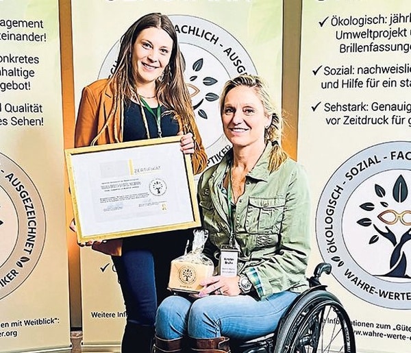 Mai 2023: Johanna (links) erhält das Wahre-Werte-Optiker-Zertifikat 2023/24 von Botschafterin Kirsten Bruhn (Bild: Förster Optik)