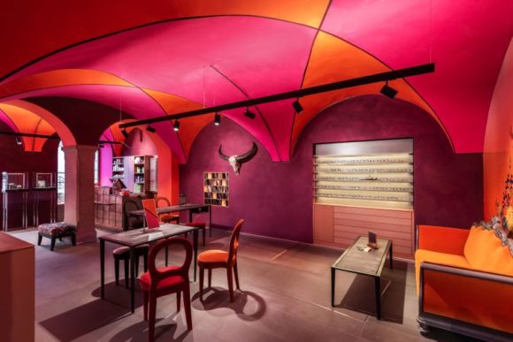 Ein paar Treppenstufen geht es runter von der Münsterbrücke zur Uferpromenade und zum Eingang von Stoffels Optik. Schon von draußen fallen durch die schönen schmalen Schaufenster mit Rundbogen die ungewöhnlichen Farben drinnen auf: Fuchsia, Violett, Orange und Ochsenblutrot von Decke und Wänden faszinieren gleich beim Eintreten – nicht grell und überfordernd, sondern abgedämpft, bewusst unregelmäßig gestrichen und durch die Lehmfarben sehr samtig wirkend, werden die Bögen der romanischen Decke betont.