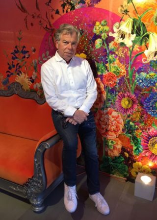 Der Künstler dieses Hinguckers, Jakob Schlaepfer, war bekannt für seine Couture-Stoffe für Chanel, Prada und Miu Miu. Seit einigen Jahren hat das Schweizer Label auch Tapeten-Sujets im Programm. Individuell ausgearbeitet und veredelt, wie hier mit einer glitzernden Hologramm-Folie, kommt das Unikat auf einen fünf-stelligen Betrag. Aber man wollte es „speziell“, so Michael Stoffels, und schätzt und unterstützt „swiss made“-Design.